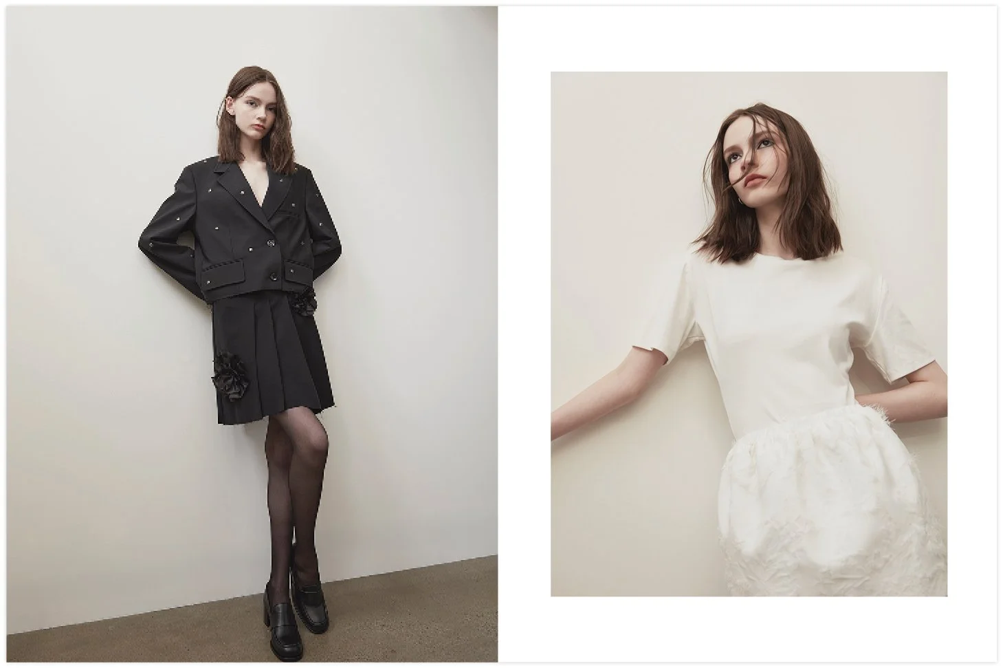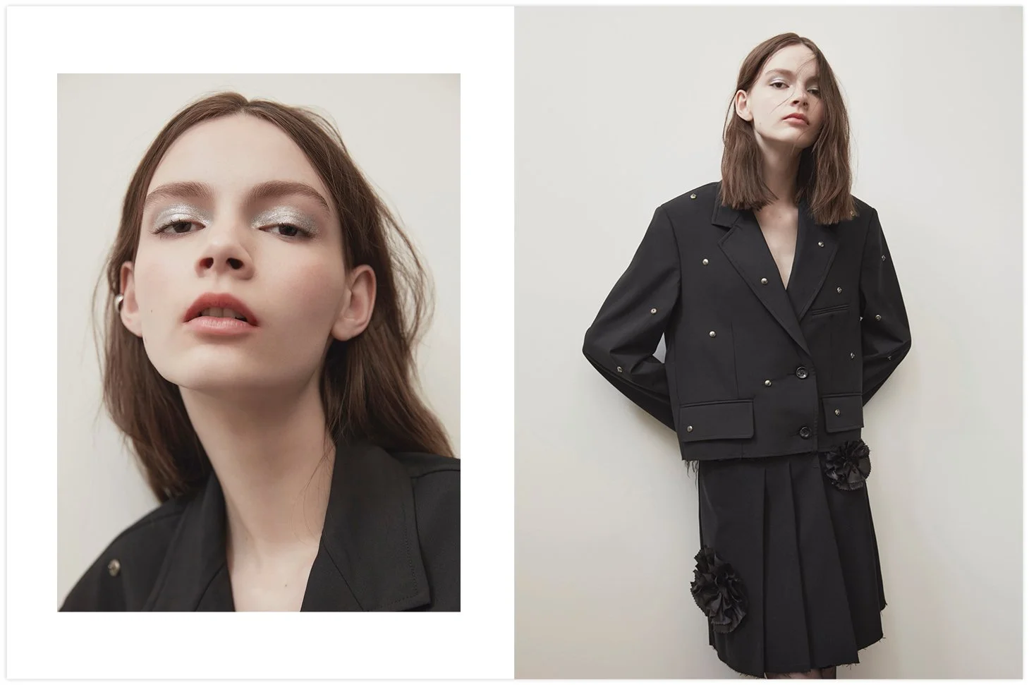 CLAUDIE PIERLOT jacket, NEIL VERNON skirt, CLAUDIE PIERLOT ballet flat.